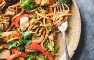 Seasoned chicken breast, Thai rice noodles, red onion, red bell pepper, carrots, cabbage, garlic, spicy peanut sauce, sesame seeds, peanuts, green onion, lime wedge