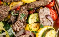 Roasted red potatoes, Angus flank steak, green bell pepper, red bell pepper, zucchini, yellow squash, carrots, red onion, creamy peppercorn sauce, green onion