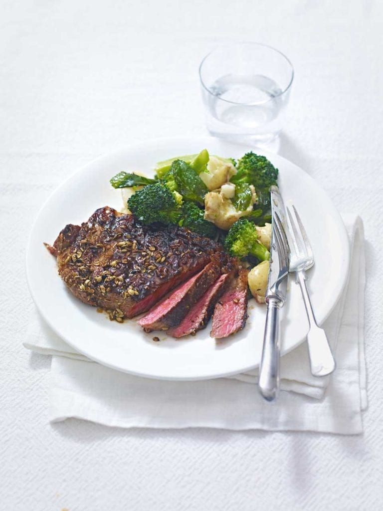 Seasoned Angus flank steak, red potatoes, organic broccoli, lemon garlic steak sauce, green onion