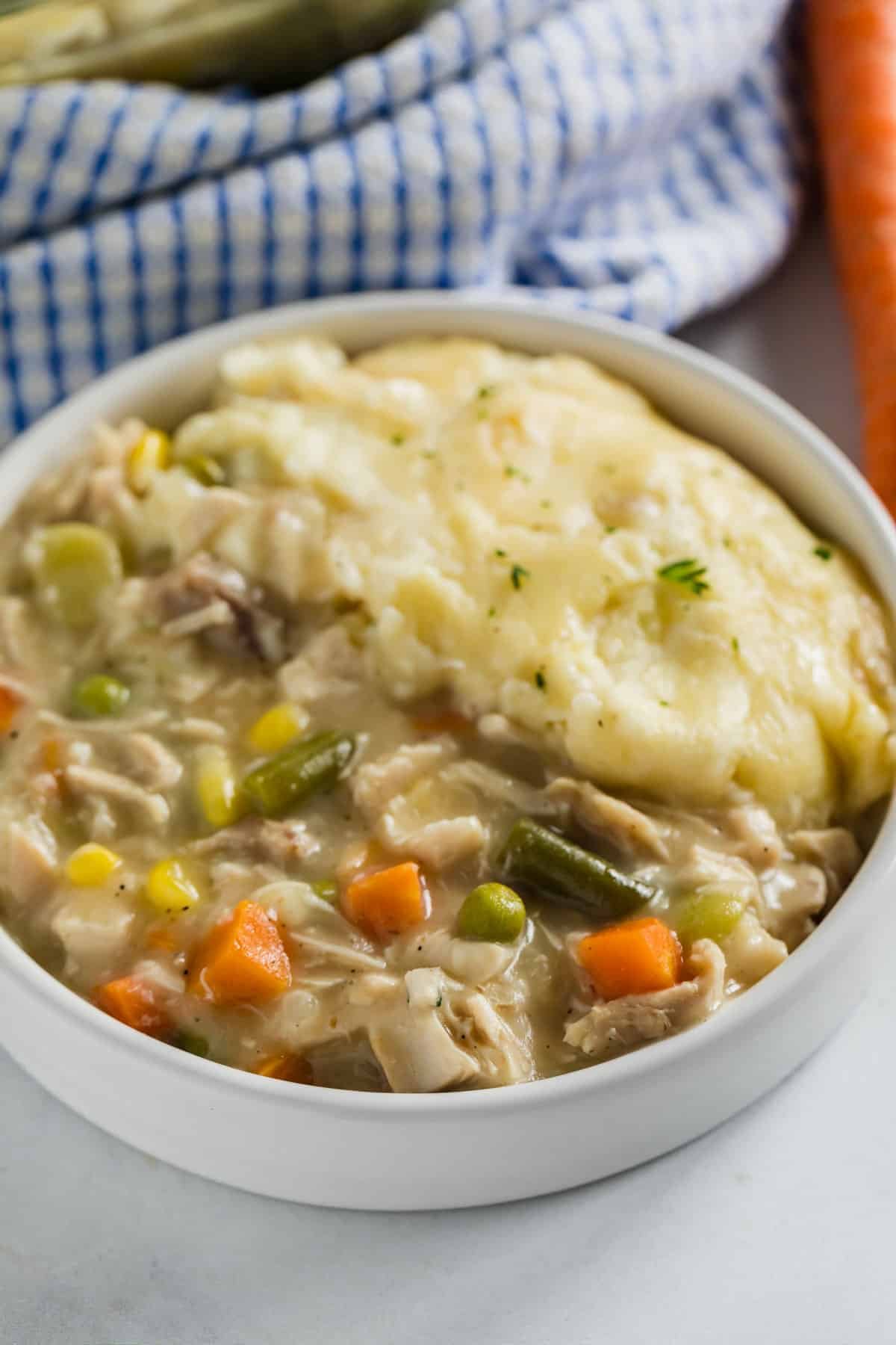 Mashed red potatoes, shredded rotisserie chicken breast, green peas, sweet corn, carrots, chicken gravy, mozzarella cheese, green onion