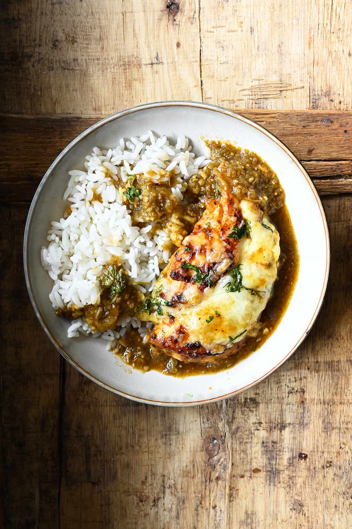 Cilantro lime Thai Hom Mali Jasmine rice, seasoned chicken breast, refried beans, white onion, Mexican cheese, salsa verde, cilantro
