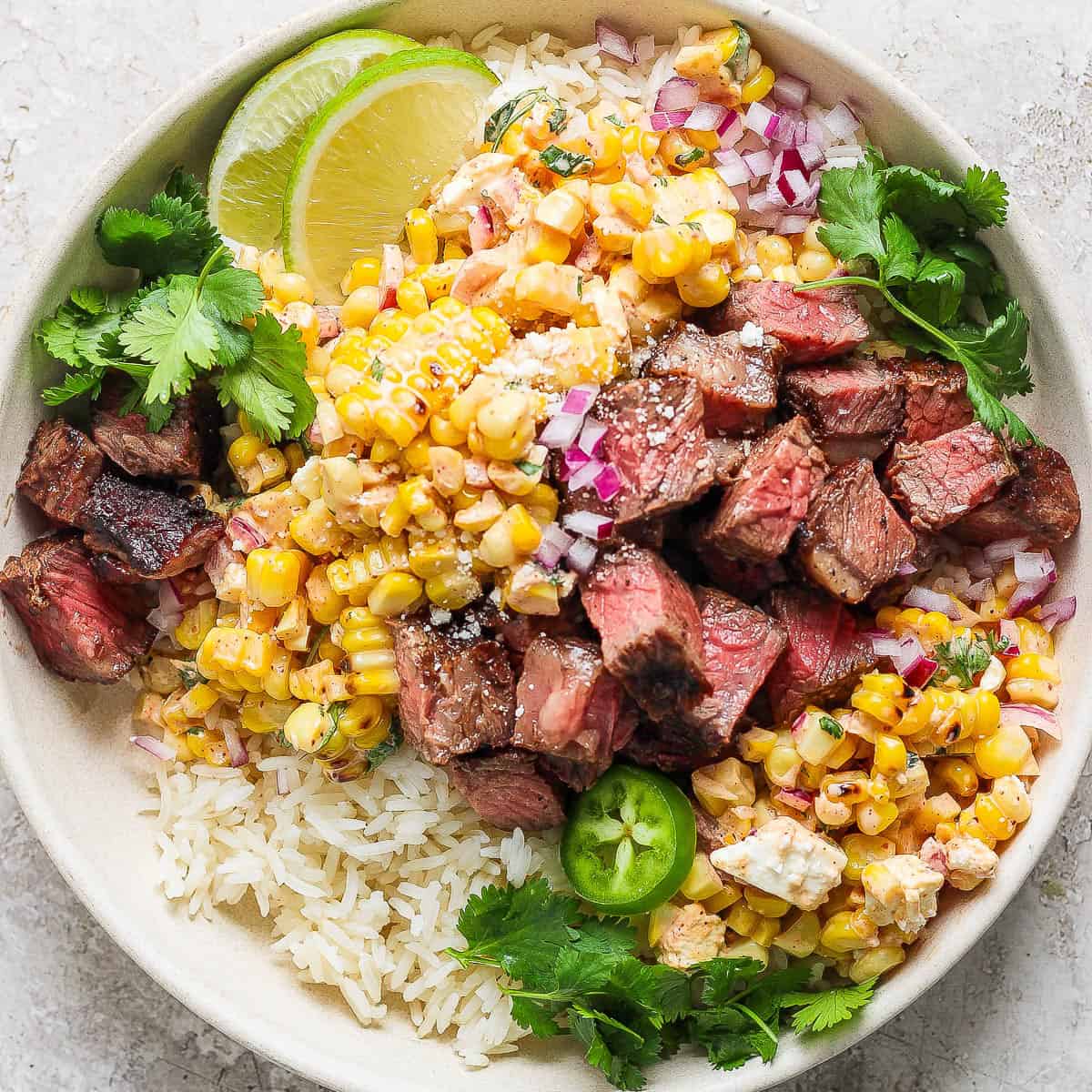 Cilantro lime Thai Hom Mali jasmine rice, seasoned grass-fed beef sirloin, sweet corn, onion, bell peppers, fresh jalapeño, cabbage, cojita cheese, elote creama, cilantro