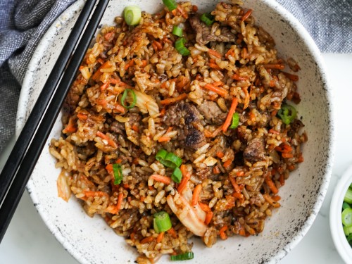 Kimchi fried rice, marinated beef, Korean pickled cucumbers, carrots, spicy umami sauce, green onion, sesame seeds