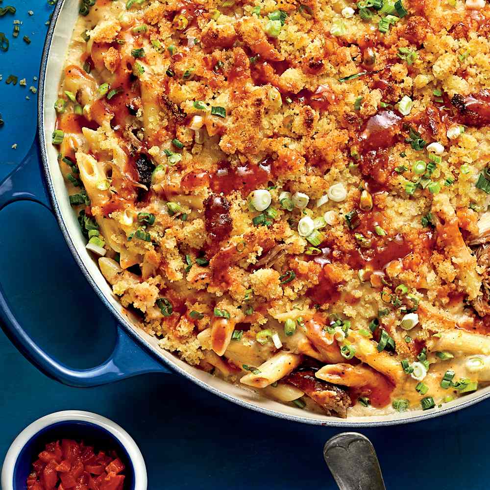 Whole wheat penne rigate, shredded BBQ smoked pork, bacon bits, 10 month aged parmesan cheese, BBQ cheese sauce, green onion